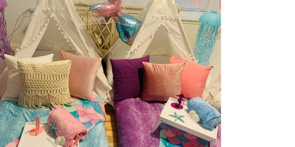 Fabric Tent, fitted and flat sheet, sleeping pillow with pillow protector fleece blanket, air mattress with protector, breakfast tray, lantern/nightlight, Party decor favors to go with theme, Decorative pillows, Rug, Party sign with fairy lights